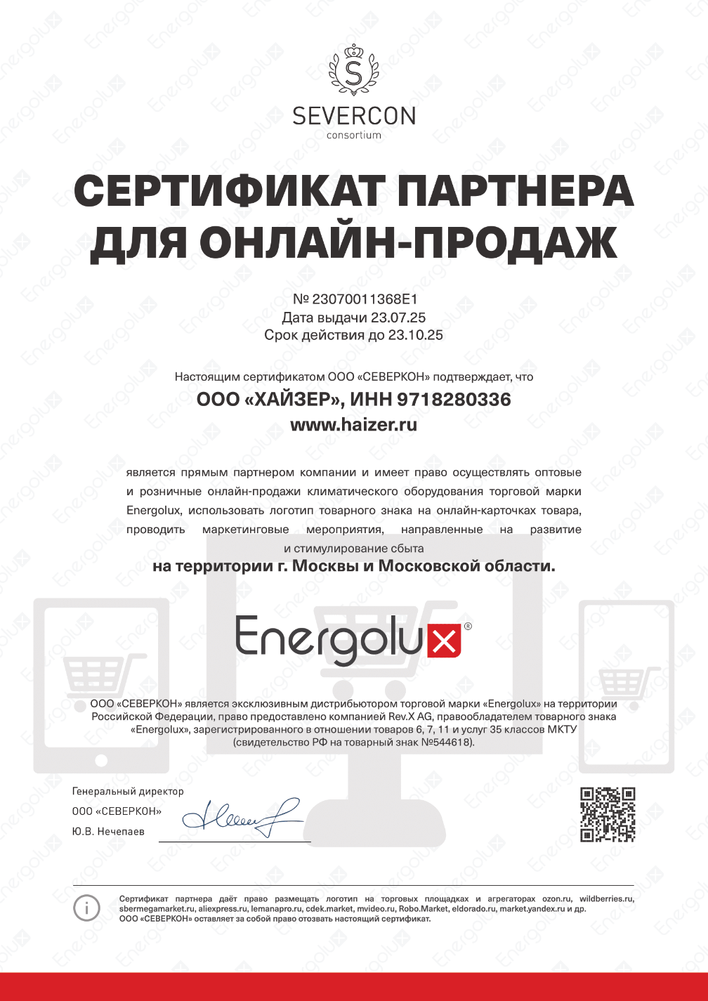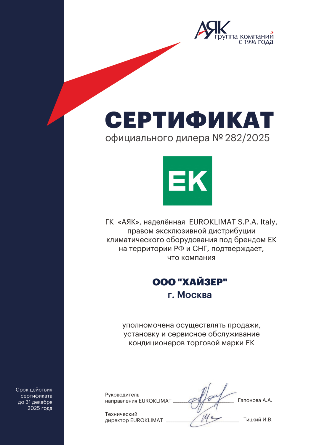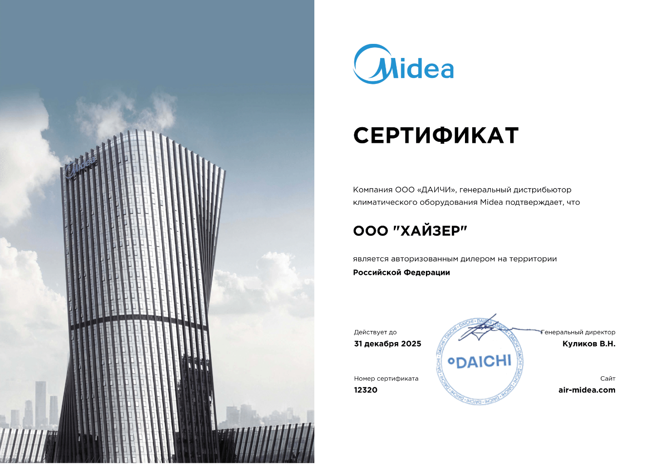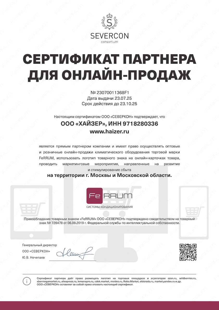 Сертификат подтверждает компетенцию компании на установку, обслуживание оборудования, продажу и ремонт.